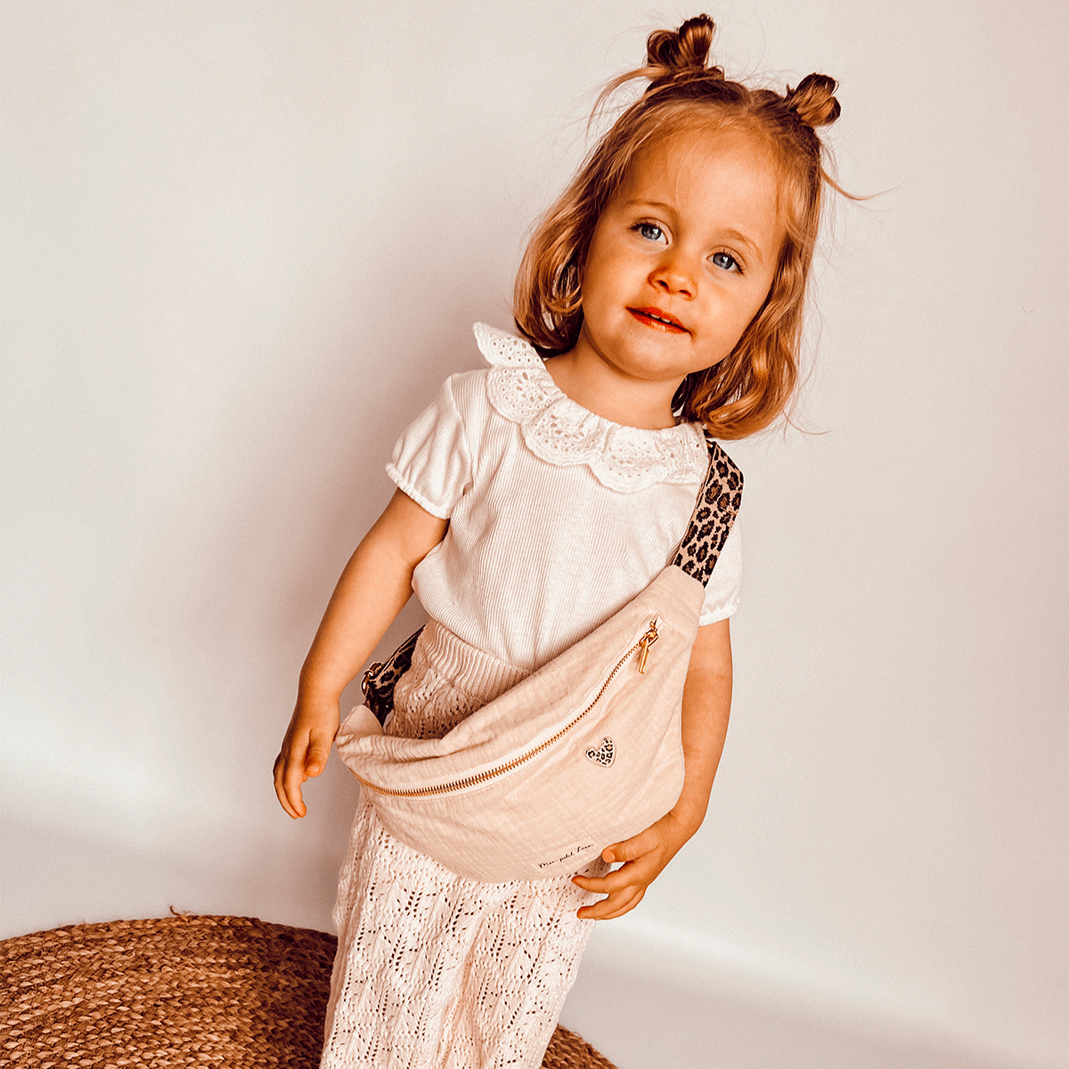 Dans sa superbe gaze de coton, avec une sangle ajustable léopard  : c'est la banane trop mignonne pour vos enfants.