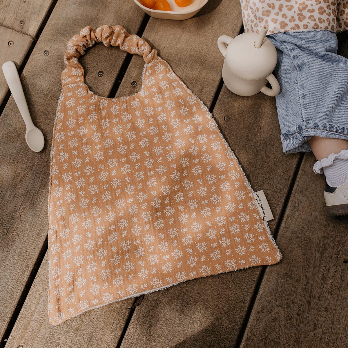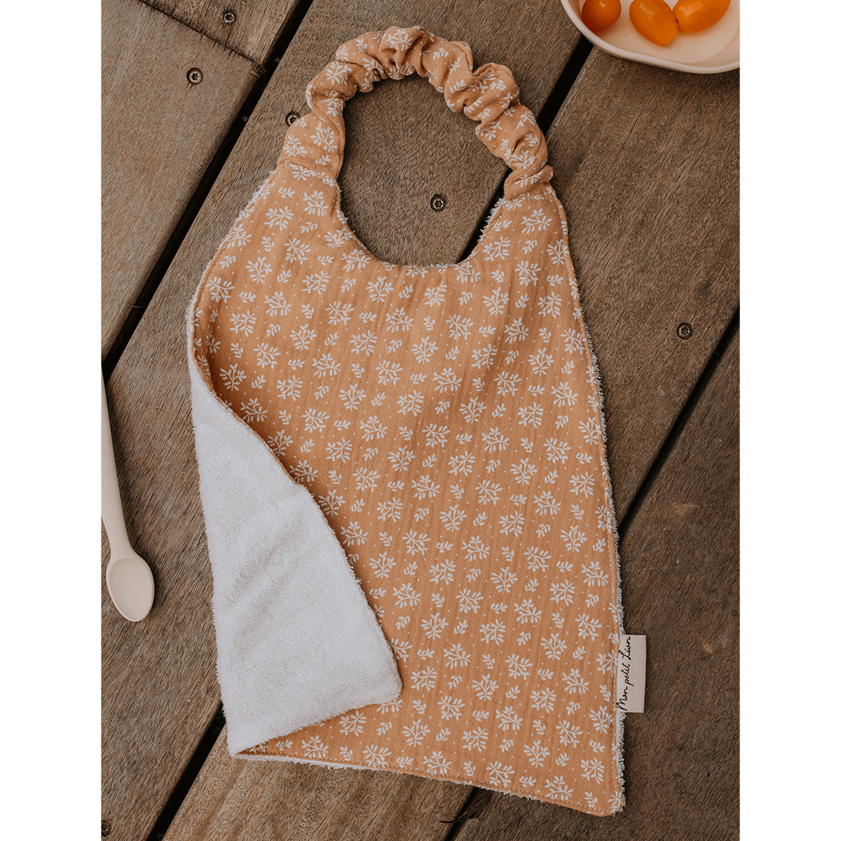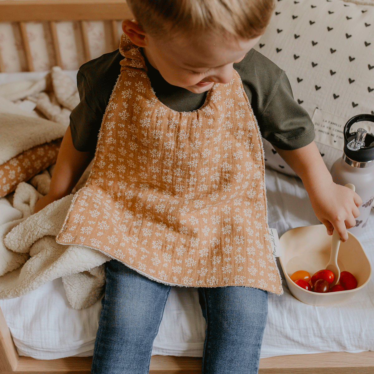 Celui est tellement pratique : le bavoir en gaze de coton et éponge, avec son tour de cou élastiqué pour que l'enfant puisse le mettre tout seul.