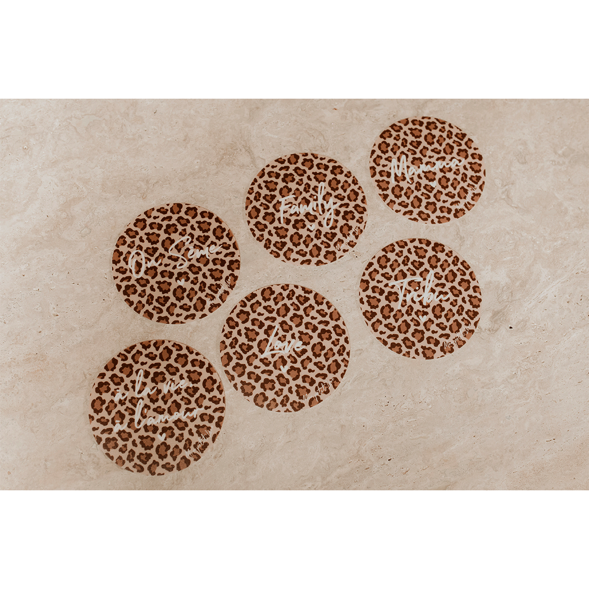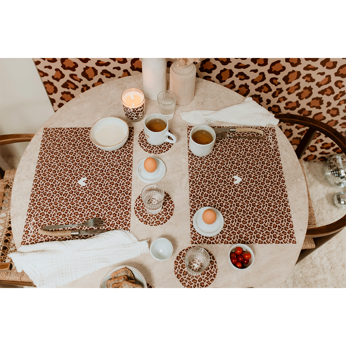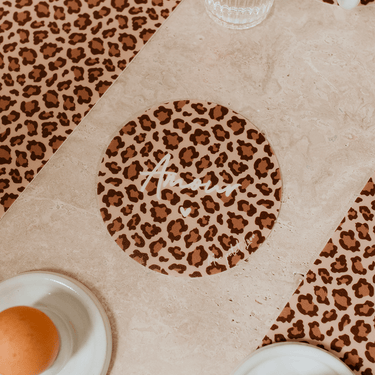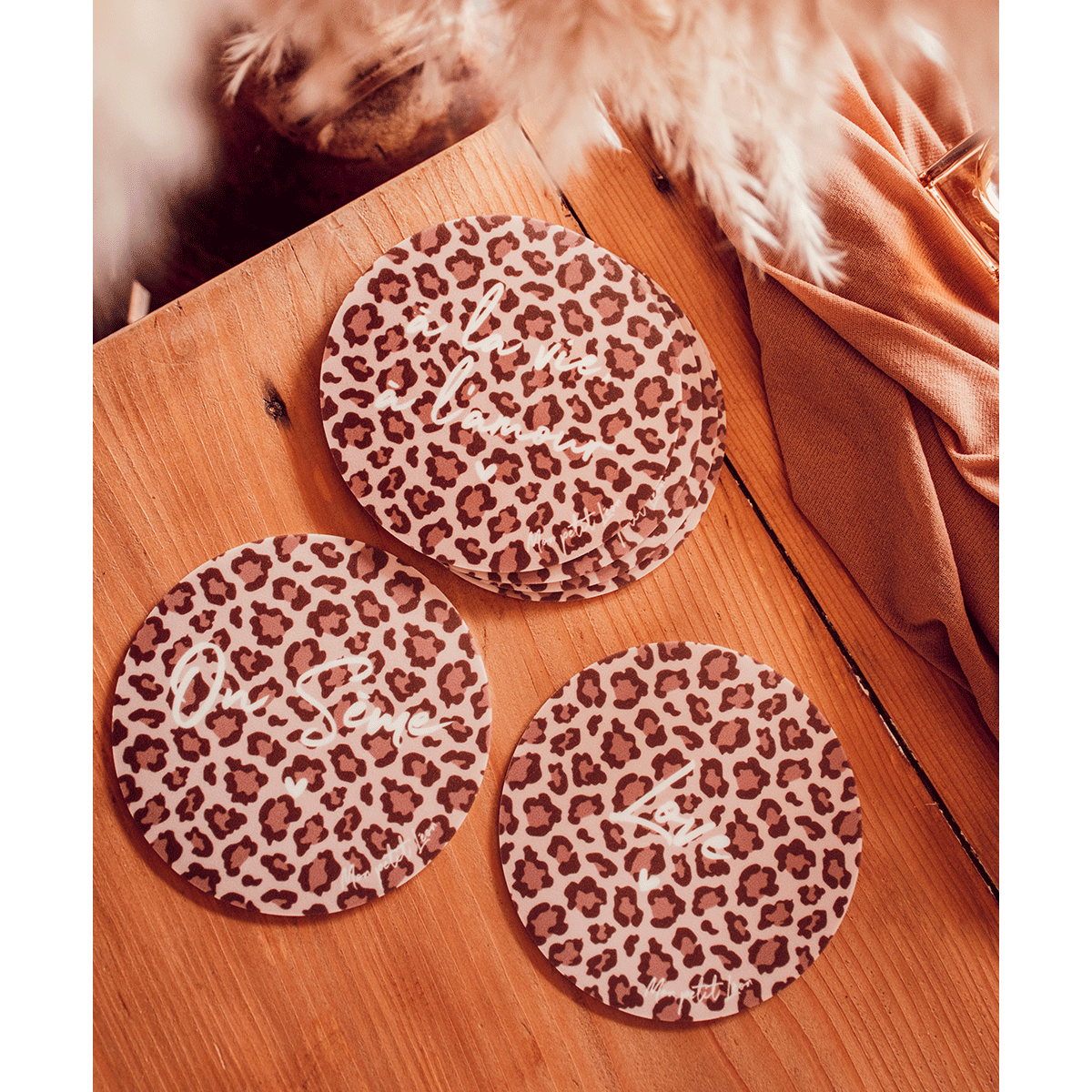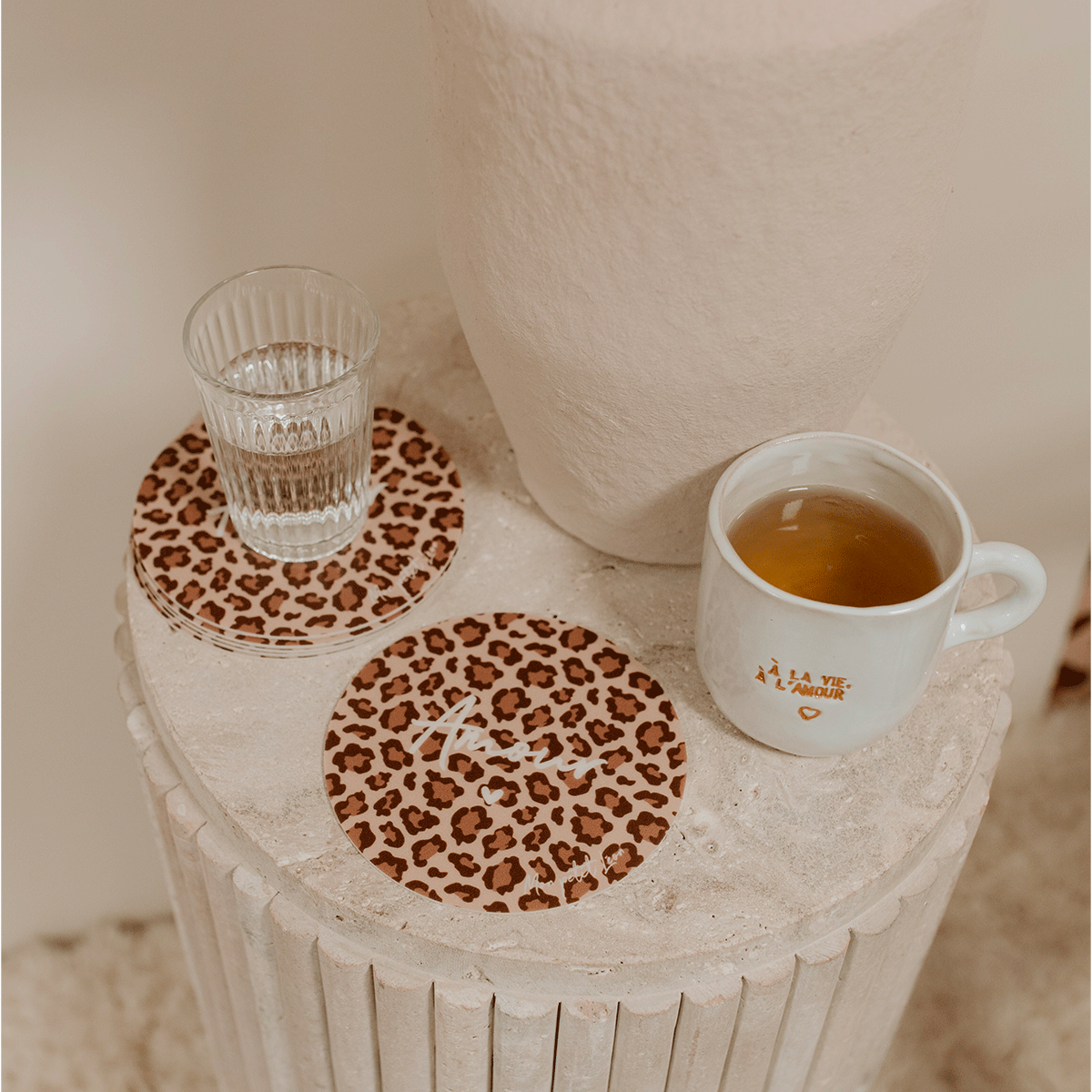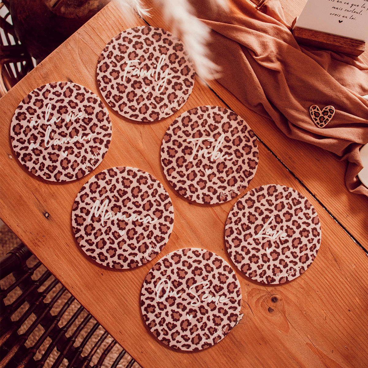 Protégez et décorez votre table avec style grâce à nos dessous de verre vinyle avec notre motif iconique léopard et l'inscription de votre choix dans la liste de nos messages iconiques ♡