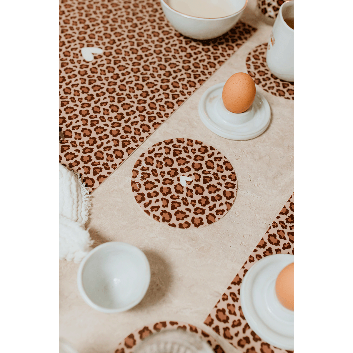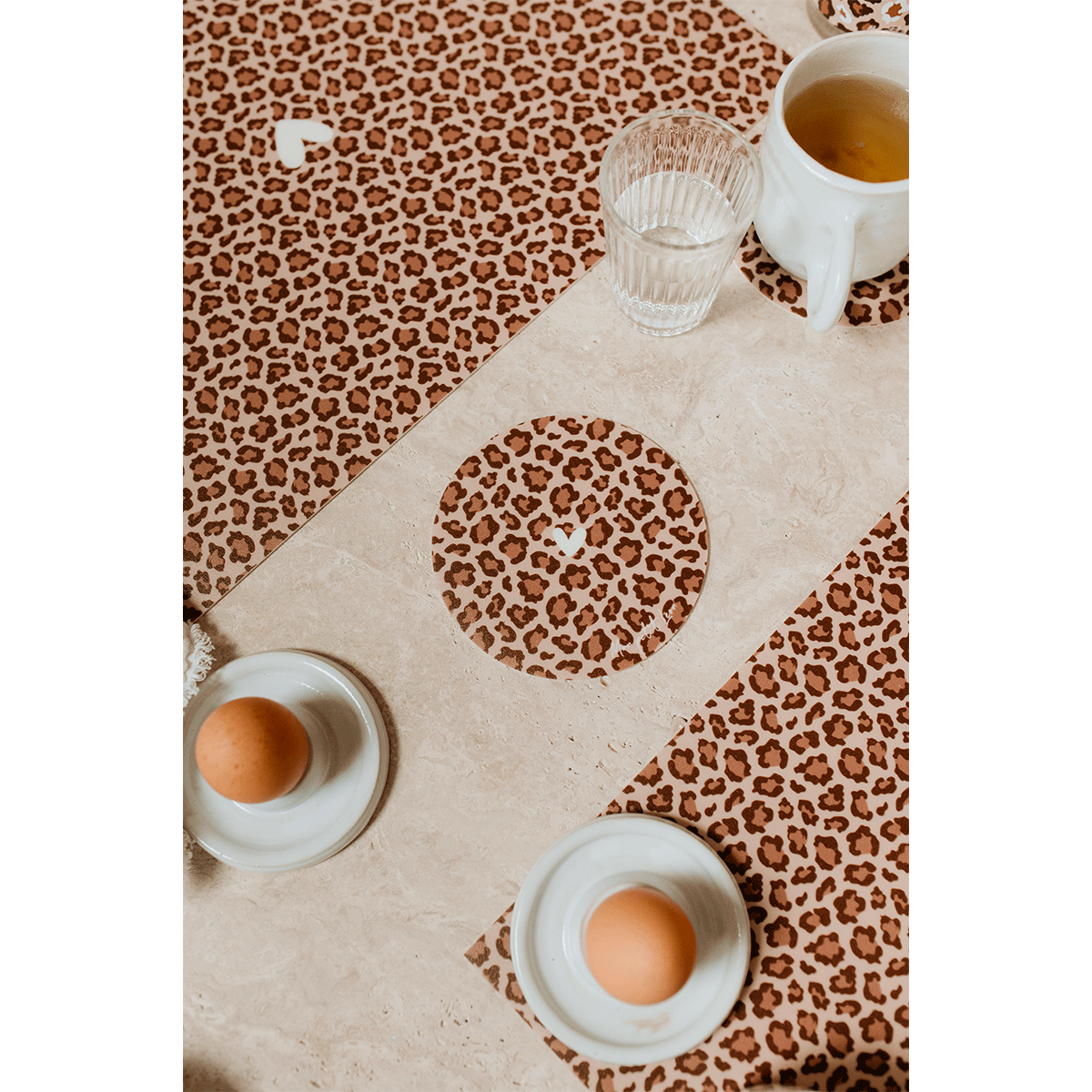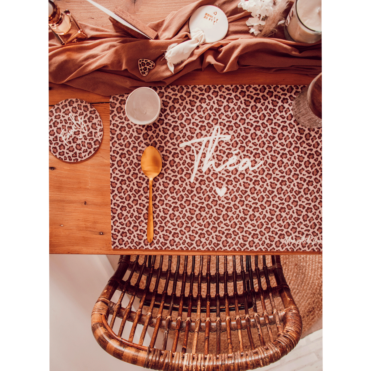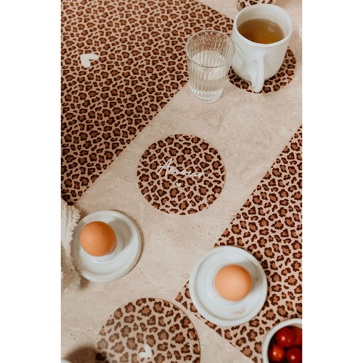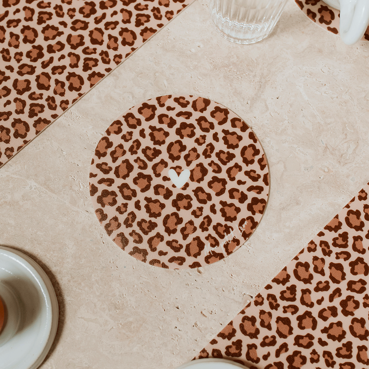 Protégez et décorez votre table avec style grâce à nos dessous de verre vinyle avec notre motif iconique léopard et l'inscription de votre choix dans la liste de nos messages iconiques ♡