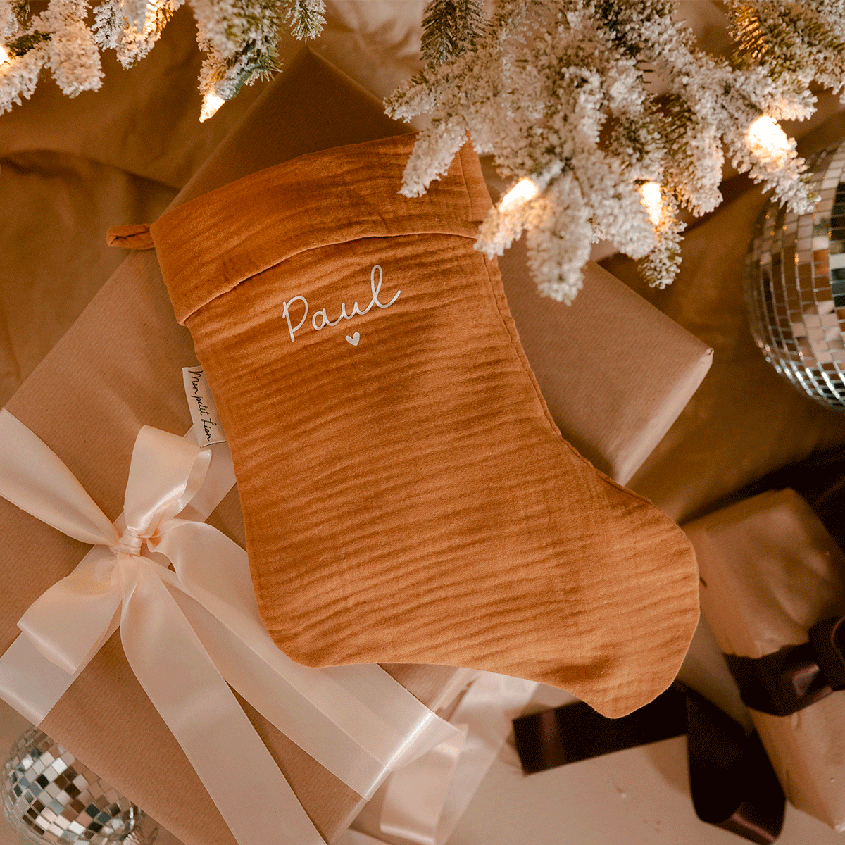 Dans une superbe gaze de coton & équipée d'une petite boucle pour pouvoir la suspendre, elle sera un superbe élément de décoration pour la période de Noël.