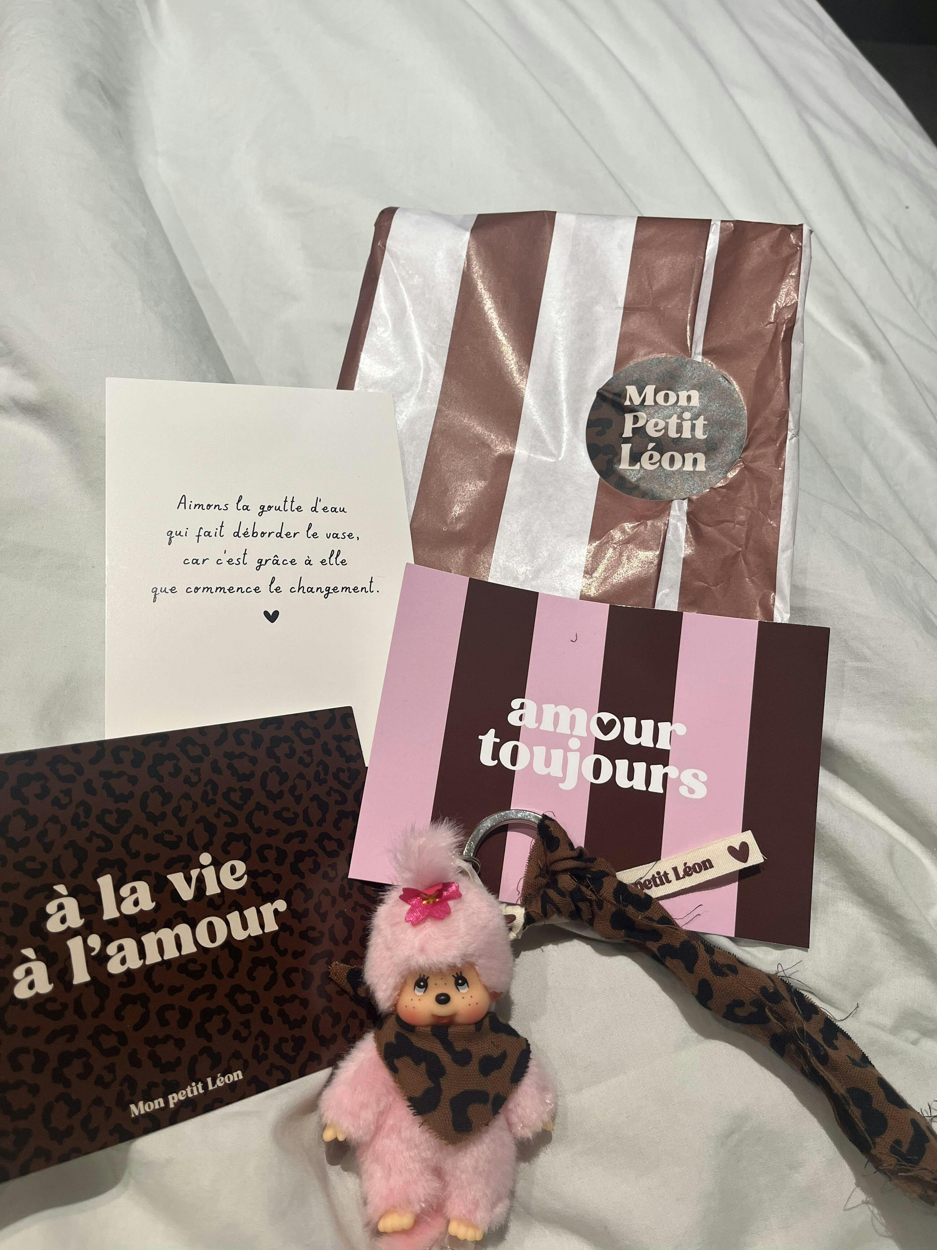 Chaque kiki a un bandana en gaze de coton, ainsi qu'un ruban en gaze de coton assorti au bandana et un ruban écru sérigraphié Mon petit Léon.