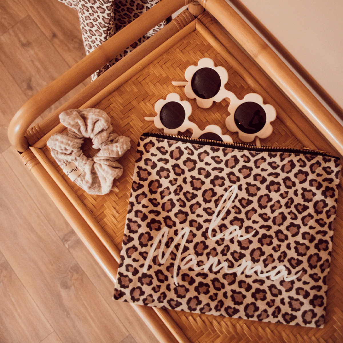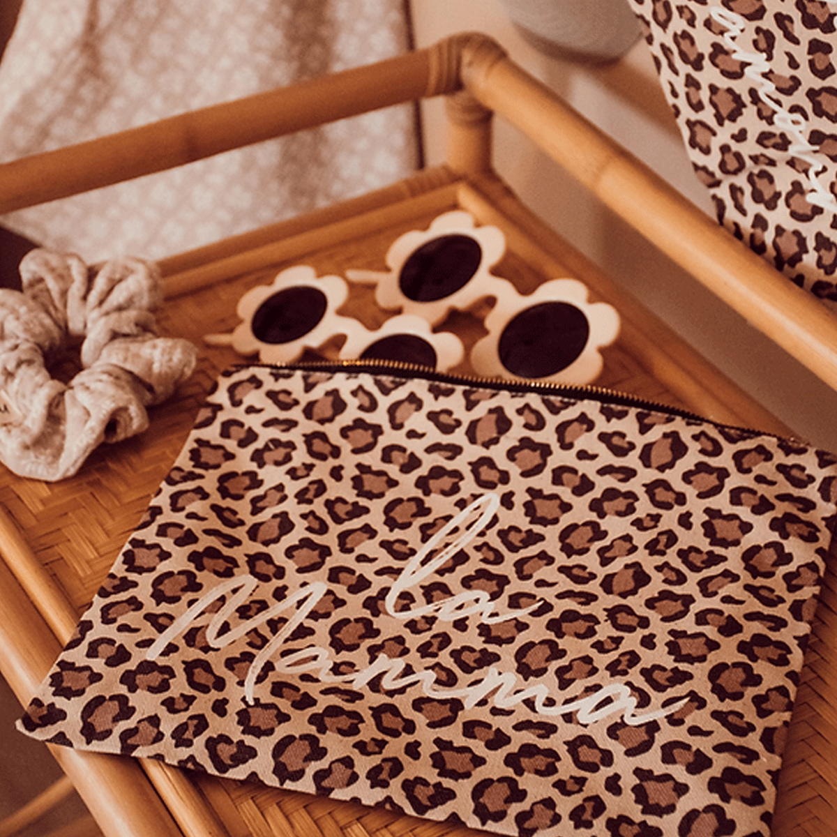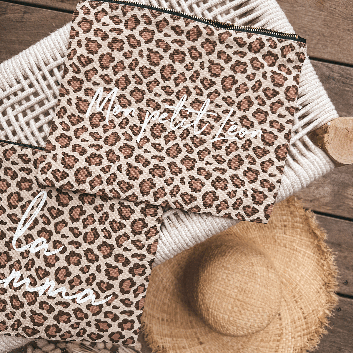 Imprimé léopard avec inscription en sérigraphie blanche " la Mamma" au recto et "Mon petit Léon" au verso.