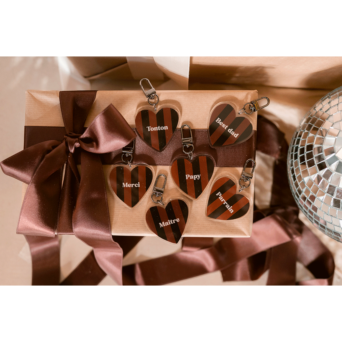 Ici la version rayures marrons et noires avec plusieurs inscriptions à choisir.