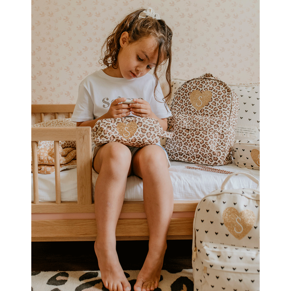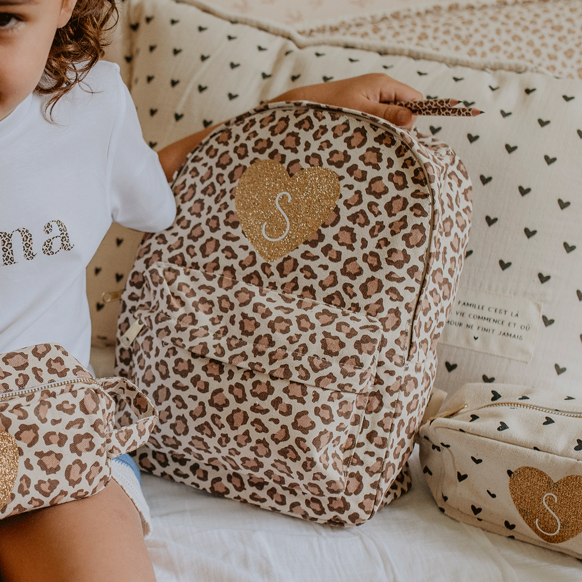 Un sac à dos avec un imprimé all over reprenant nos motifs iconiques : Petits coeurs & Léopard.