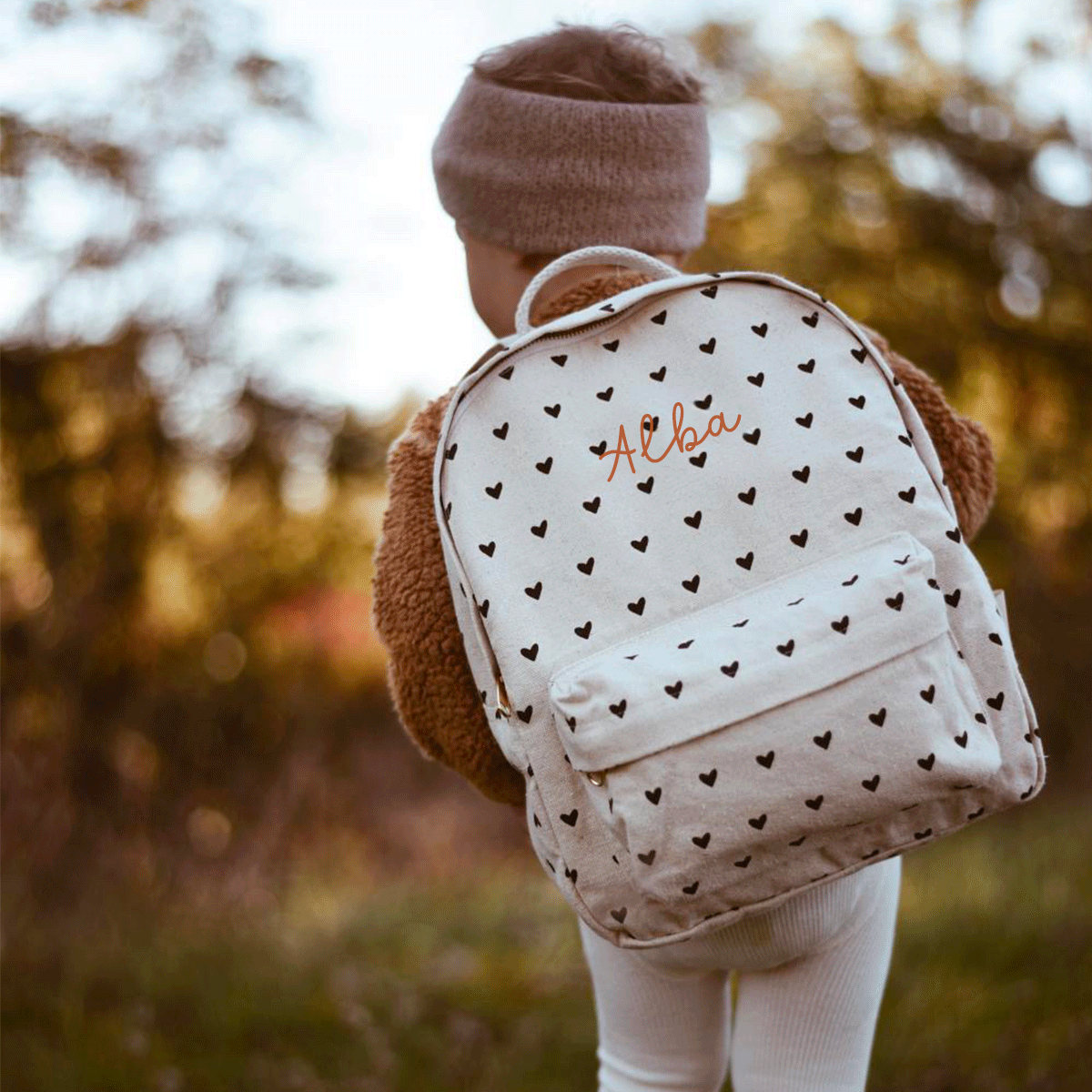 Un sac à dos avec un imprimé all over reprenant notre imprimé iconique léopard, l'imprimé tout doux petits coeurs noirs ou encore le coloris mixte terracotta.