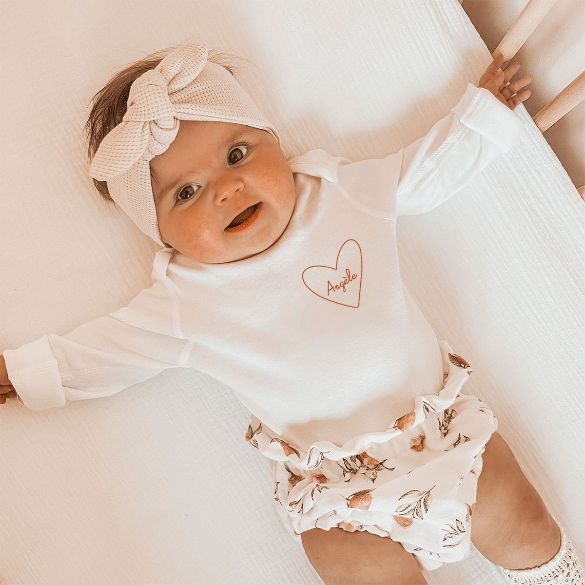 Conseil taille : Billie a 5 mois et porte le body manches longues en 3/6 mois.