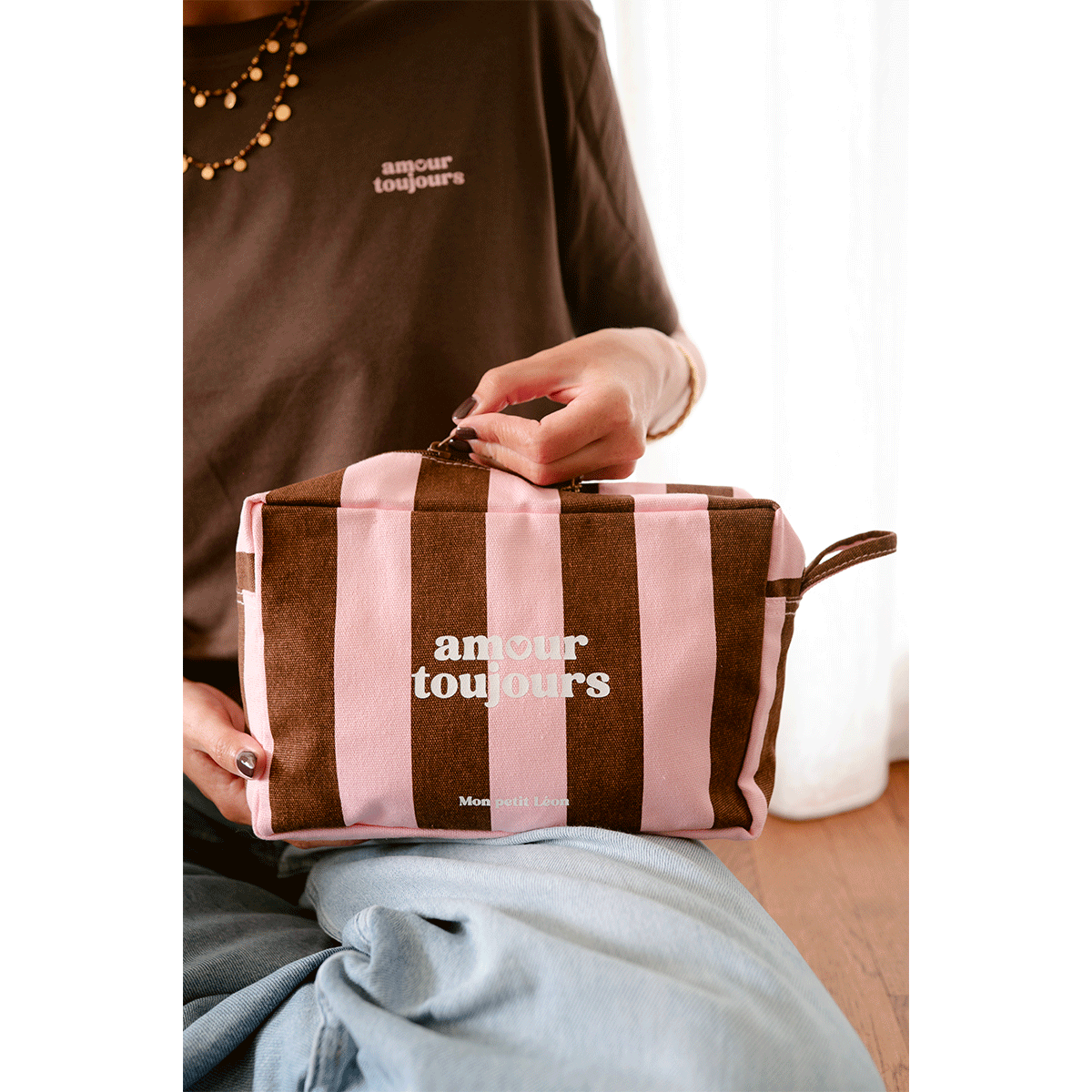 Une trousse de toilette en toile de coton épaisse et entièrement doublée en déperlant à l’intérieur.